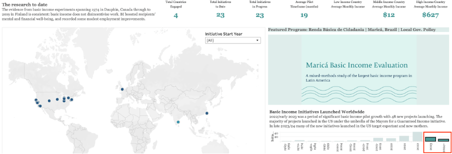 - Clicking on a time period in the ‘Basic Income Initiatives Launched Worldwide’ bar chart will dynamically filter the map by that same time period, including the summary statistics at the top of the page. Users can choose one or more time periods (by holding down the control button). This will aid users in understanding geographical clusters of projects over time.